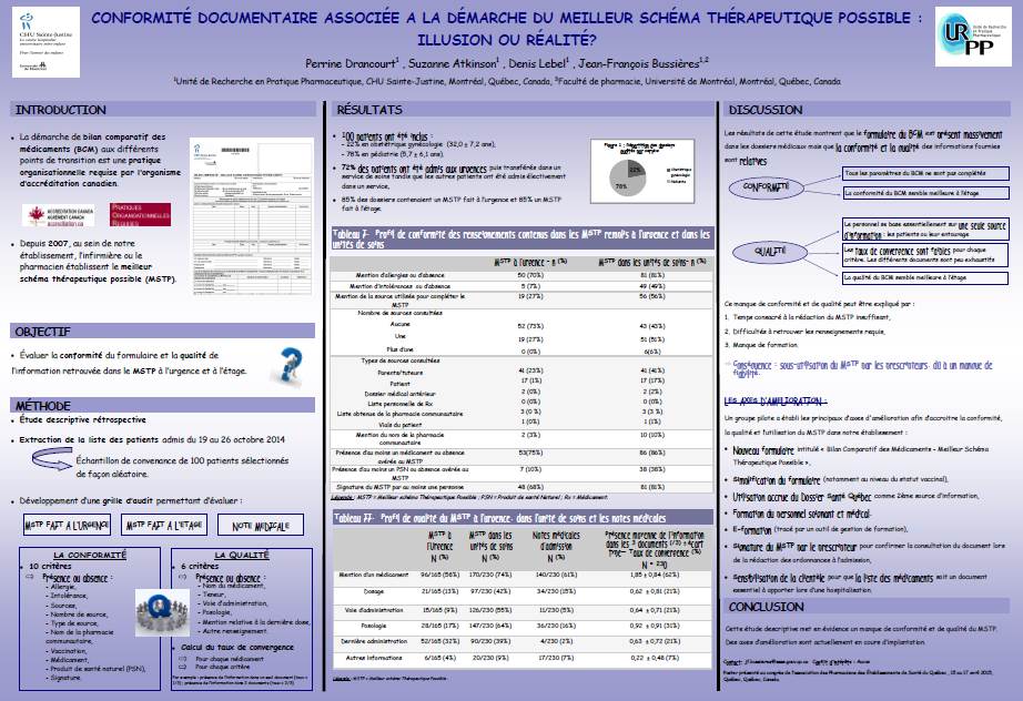 On peut consulter notre affiche présentée dans le cadre du congrès annuel de l’Association des pharmaciens des établissements de santé du Québec tenu à Québec du 15 au 17 avril 2015.