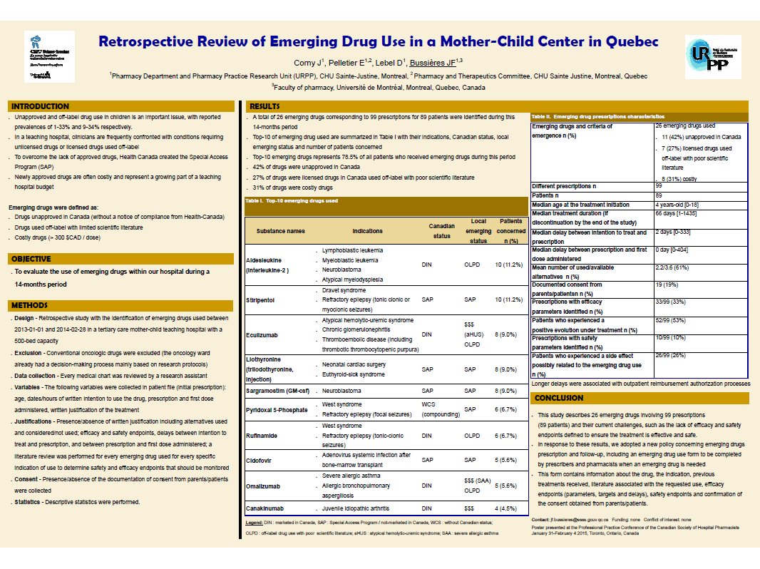 On peut consulter l’affiche présentée au congrès Professional Practice Conference de la Société canadienne des pharmaciens d’hôpitaux (SCPH/CSHP) du 31 janvier au 4 février 2015 à Toronto, Ontario, Canada.