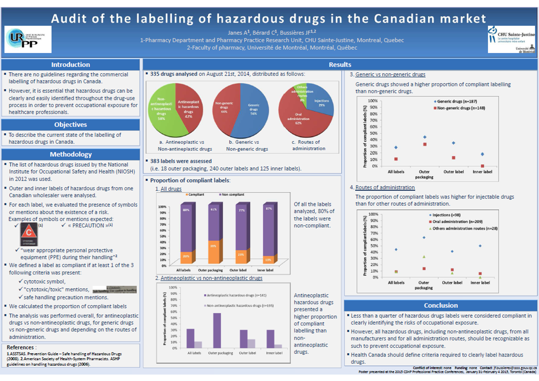 Dans le cadre des travaux de l’URPP, nous avons utilisé la liste des médicaments dangereux NIOSH et avons analysés les étiquettes externes et internes de ces médicaments afin de calculer la proportion d’étiquette conforme au niveau de risque.