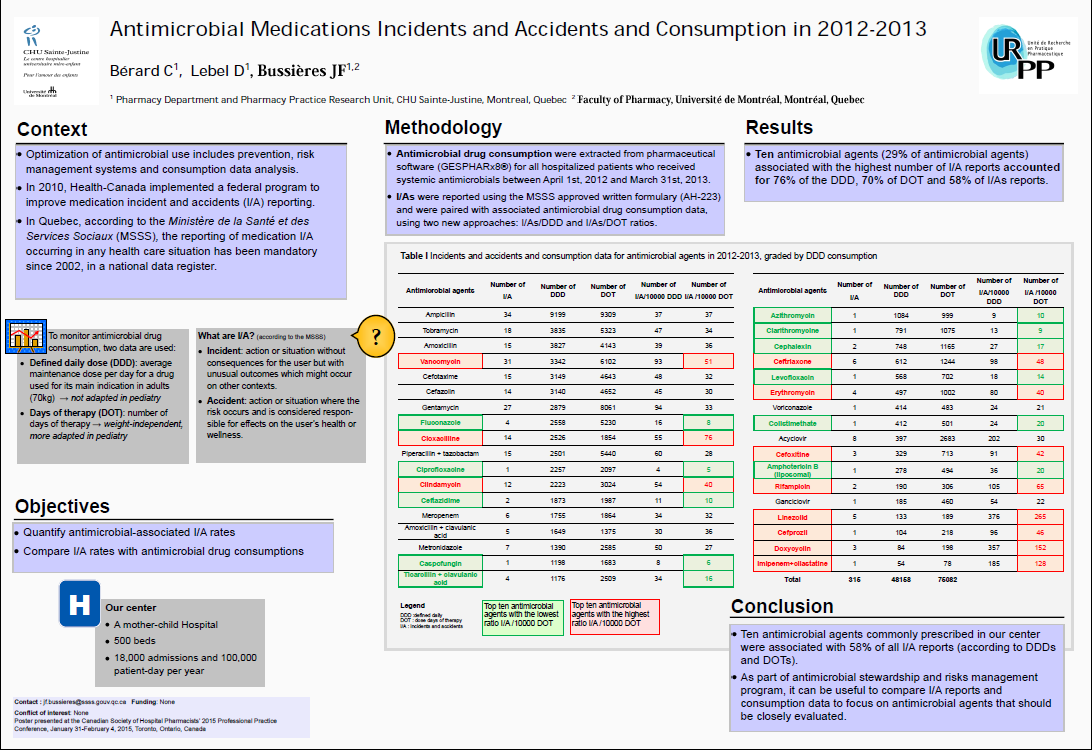 On peut consulter l’affiche présentée au congrès Professional Practice Conference de la Société canadienne des pharmaciens d’hôpitaux (SCPH/CSHP) du 31 janvier au 4 février 2015 à Toronto, Ontario, Canada.