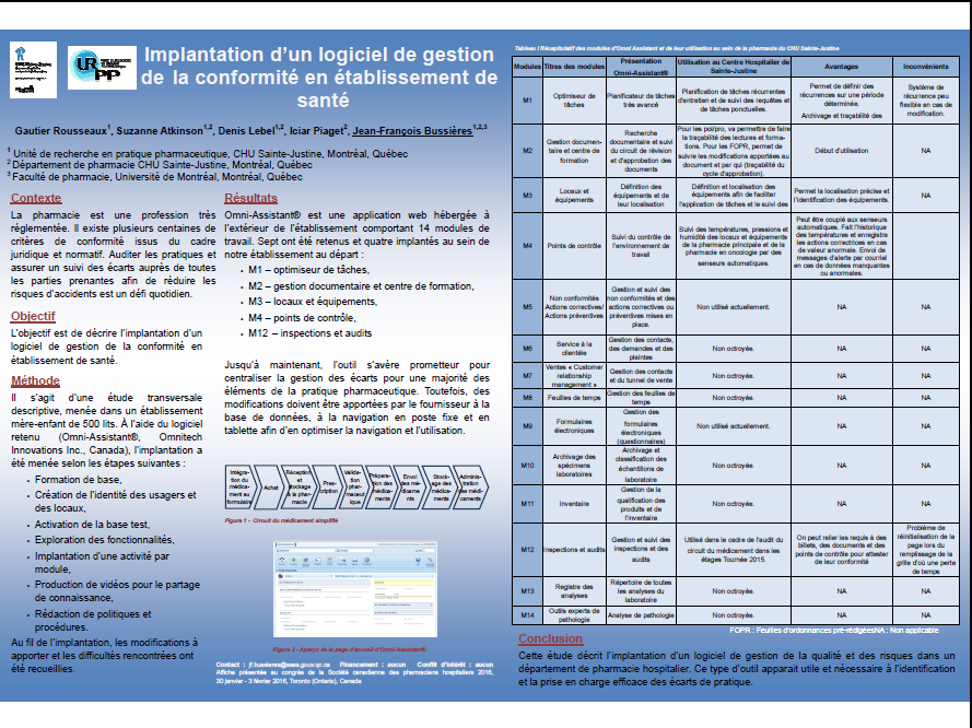 Dans le cadre des travaux de l’URPP, nous avons mené une étude transversale afin de décrire l’implantation d’un logiciel de gestion de la conformité (Omni-Assistant®, Omnitech Innovations Inc., Canada) dans un département de pharmacie hospitalier. Ce type d’outil apparait utile et nécessaire à l’identification et à la prise en charge efficace des écarts de pratique. Jusqu’à maintenant, l’outil s’avère prometteur pour centraliser la gestion des écarts pour une majorité des éléments de la pratique pharmaceutique. Toutefois, des modifications doivent être apportées par le fournisseur à la base de données, à la navigation en poste fixe et en tablette afin d’en optimiser la navigation et l’utilisation.