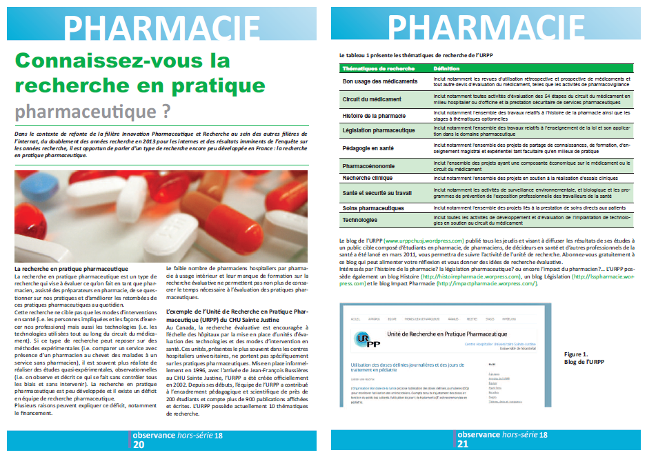 En France, dans le contexte de refonte de la filière Innovation Pharmaceutique et Recherche au sein des autres filières de l’internat, du doublement des années recherche en 2013 pour les internes et des résultats imminents de l’enquête sur les années recherche, il est opportun de parler de ce type de recherche encore peu développée en France. Ainsi, nous avons publié un article dans la revue L’Observance afin de décrire nos activités à l’URPP et d’y définir nos thématiques de recherche.