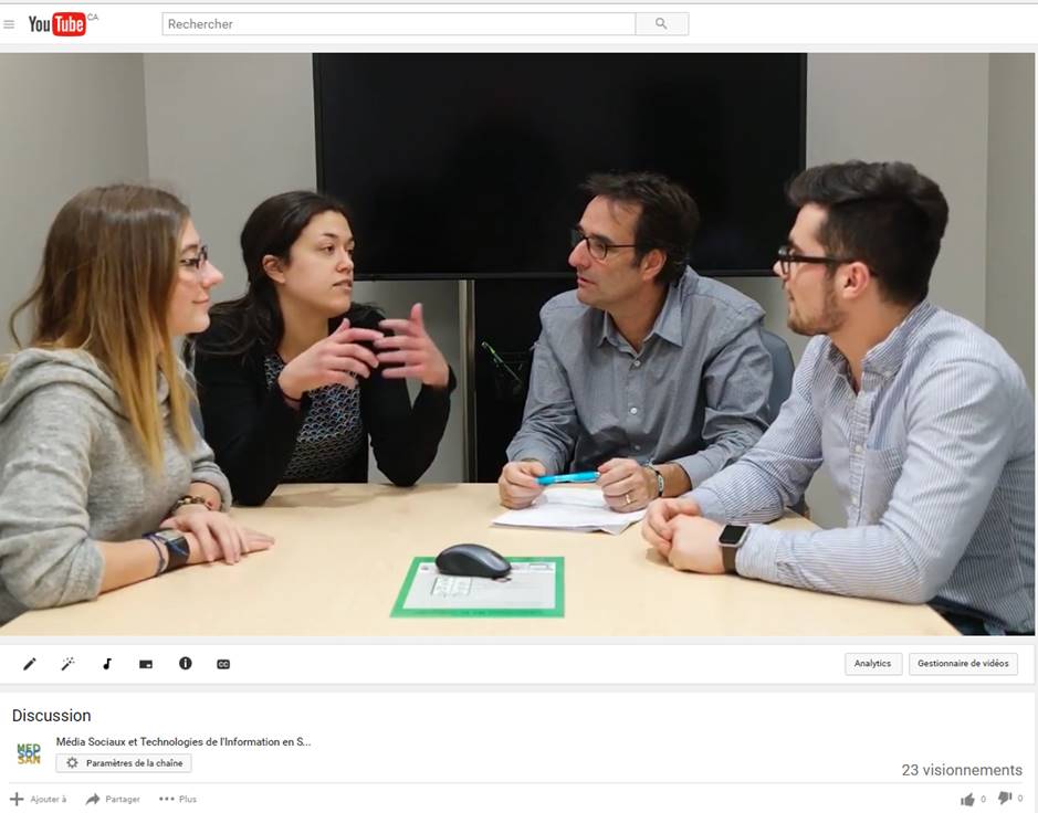 Nous vous convions à la vidéo « DISCUSSION » qui met en valeur les différents intervenants impliqués dans les vignettes et qui contribuent au lancement de notre chaîne Youtube sur l’utilisation des médias sociaux et technologies de l’information en santé. Suivez nos blogues quotidiens pour visionner au cours des prochains jours toutes les autres vidéos et bonne réflexion. À noter que ce matériel sera utilisé pour des interventions ciblées en 1ère, 2ème, 3ème et 4ème année du Doctorat professionnel en pharmacie au cours des prochaines semaines ainsi qu’à la maîtrise en pharmacothérapie avancée.