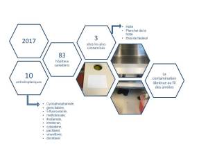 We have completed our largest environmental surveillance study to date! In 2017, 83 hospitals across Canada participated. 953 samples were analyzed for the presence of 10 antineoplastic drugs: cyclophosphamide, ifosfamide, methotrexate, cytarabine, gemcitabine, 5-fluorouracile, irinotecan, docétaxel, paclitaxel and vinorelbine. New this year: participants can access their results through a website that allows them to see their historical results and also to compare with the rest of Canada. There is no safe exposure limit for antineoplastic drugs; our study helps participating centers identify which sampling site should be targeted (those with concentrations measured above the 75th or 90th percentile that was calculated from Canadian results).