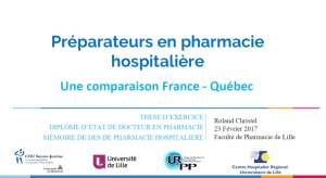 - Roland C, Guérin A, Vaconsin P, Bussières JF. Préparateurs en pharmacie hospitalière en France et au Québec : étude comparative de la formation et de l’activité (PREPAPATEURS1) Pharm Hosp Clin 2017; 52 (3) : 237-249.