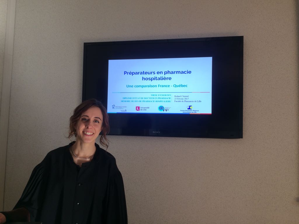 Bravo à Christel Roland qui a présenté avec succès la défense sa thèse d’exercice à la Faculté de pharmacie de l’Université de Lille le vendredi 23 février 2018. En présence de Pascal Odou, Anne-Charlotte Desbuquois, Aurélie Guérin et Jean-François Bussières (en visioconférence) et de ses proches, Christel a présenté une comparaison France-Québec des rôles et retombées des préparateurs en pharmacie hospitalière (aussi appelés assistants-techniques en pharmacie ou techniciens en pharmacie).
