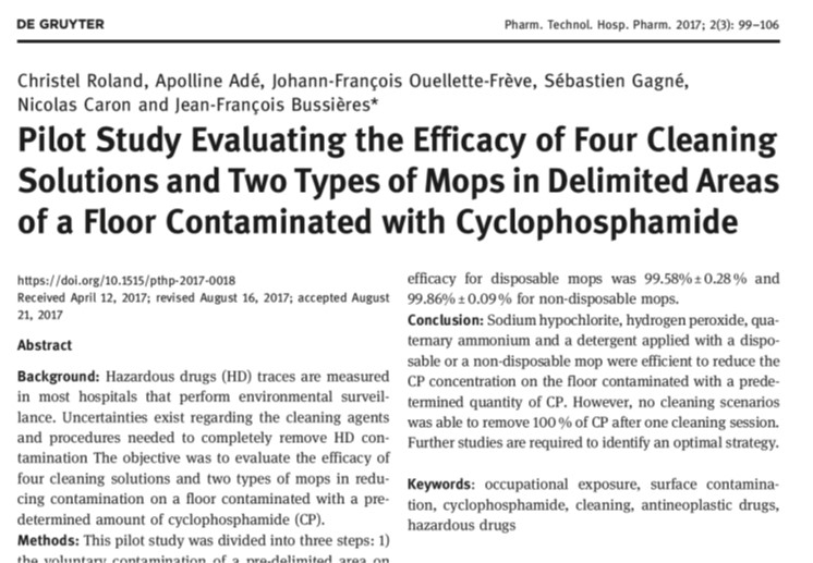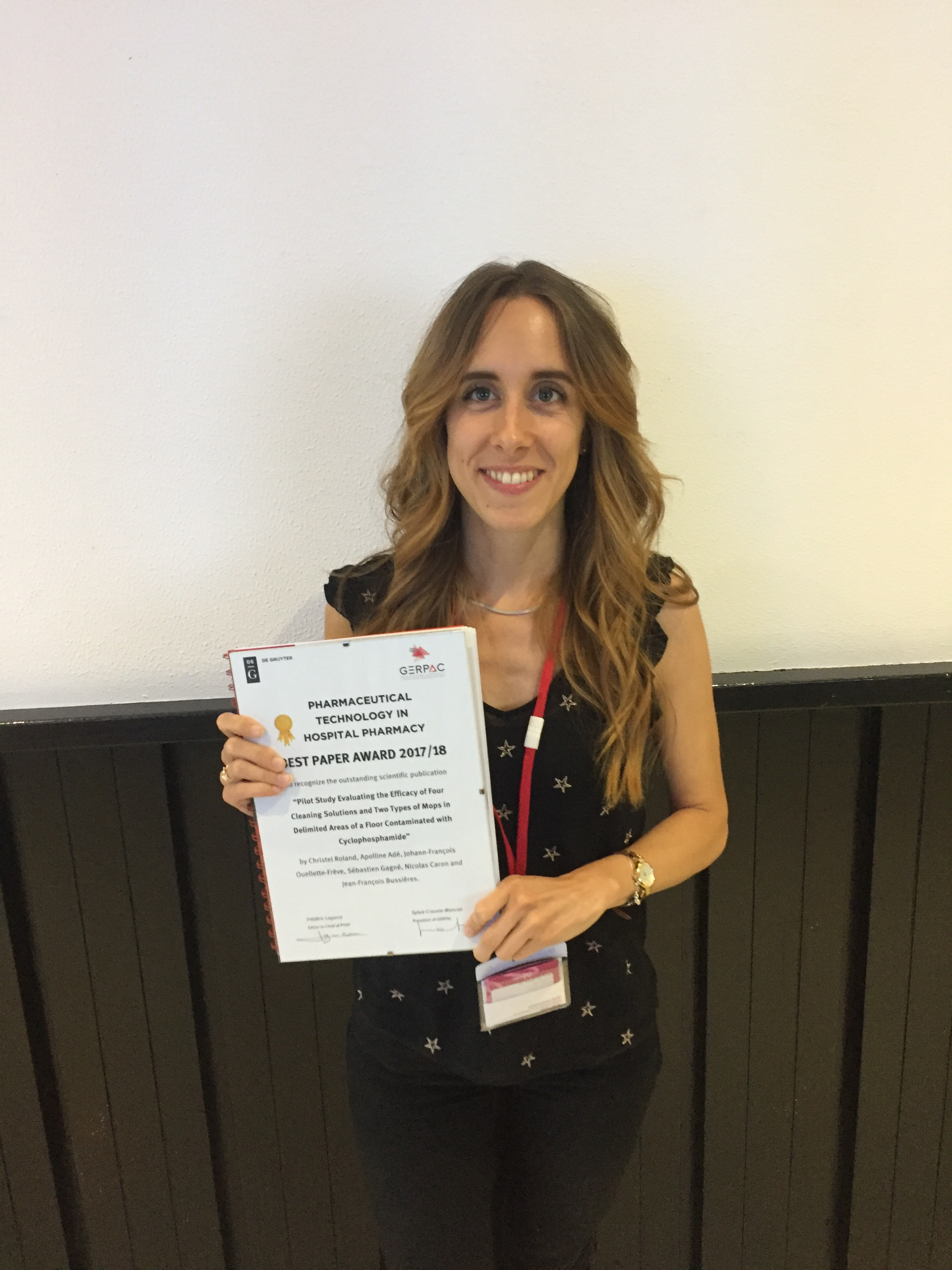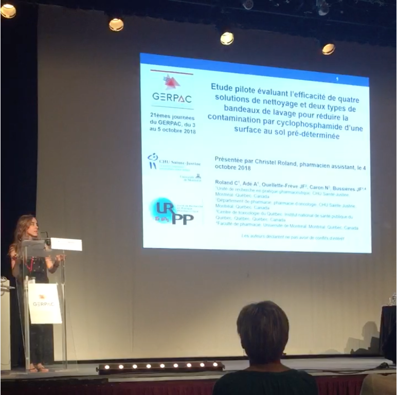 Dans le cadre du Congrès 2018 du GERPAC, Christel Rolland a présenté les résultats de travaux de l’URPP auquel elle a été associée lors de sa résidence spécialisée au sein de notre équipe. Ces travaux ont été réalisés en collaboration avec Apolline Adé, Johann-François Ouellette-Frève, Sébastien Gagné, Nicolas Caron et Jean-François Bussières au CHU Sainte-Justine. Ces travaux ont été publiés dans le journal Pharm Technol Hosp Pharm et ont été primés par le Gerpac comme étant le meilleur article de 2017. Nous remercions le jury du Gerpac d’avoir retenu nos travaux. De plus, nous invitons nos collaborateurs à consulter le Pharm Technol Hosp Pharm tant pour le contenu que comme opportunité de publication pour les travaux de recherche liés à l’utilisation de technologies en santé, incluant la surveillance environnementale.