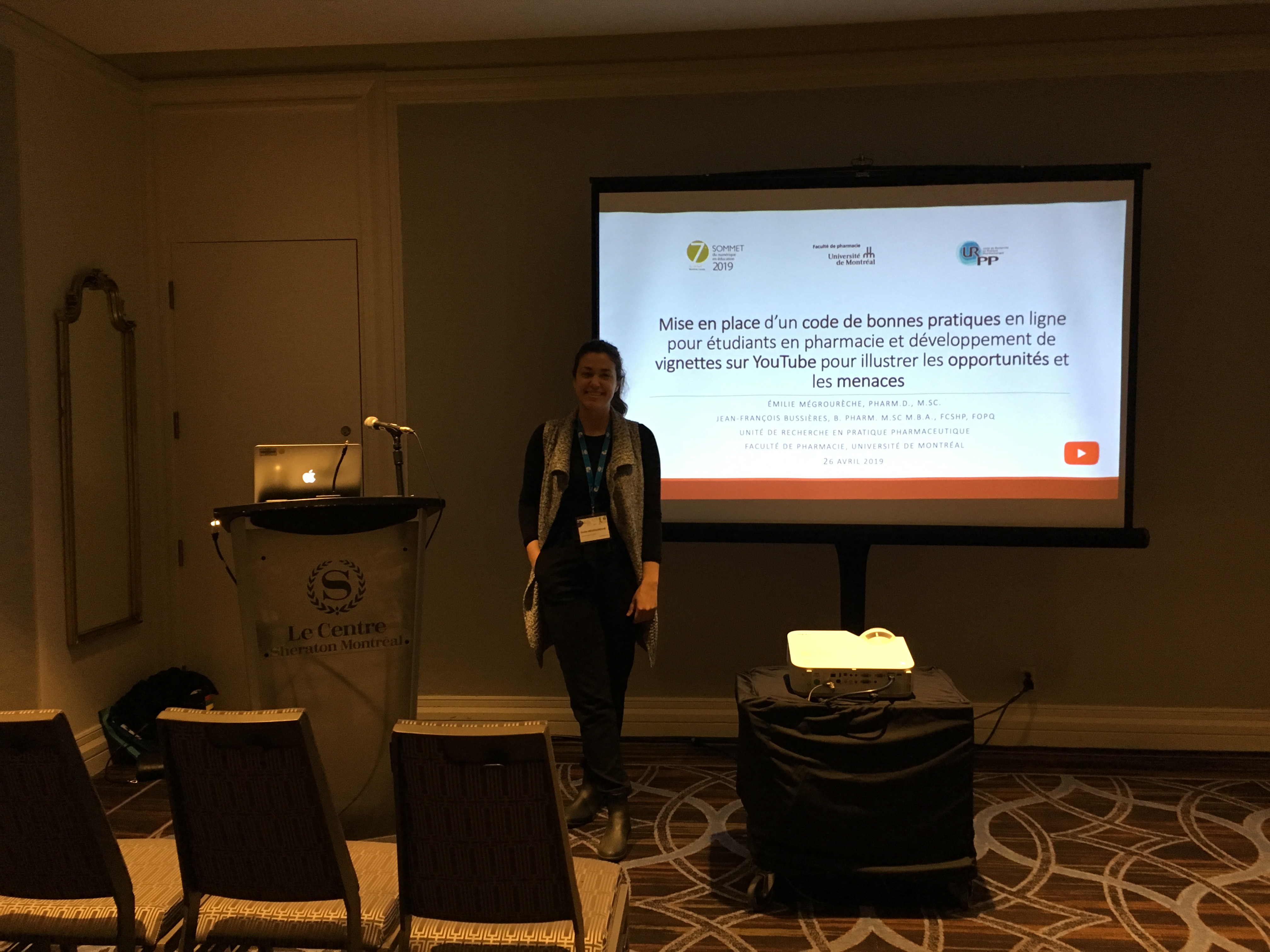 - Une deuxième présentation, en collaboration avec Émilie Mégrourèche, met en valeur la mise en place du Code de bonnes pratiques en ligne, signé par les étudiants de 1 ère année au Doctorat professionnel en pharmacie; la signature du code est précédée du visionnement de 25 vignettes vidéos sur une chaîne Youtube. Ces vignettes illustrent les menaces et les opportunités de différentes situations mettant à profit les technologies, les outils en ligne et les médias sociaux ; on peut consulter la chaîne Youtube pour visionner une ou plusieurs capsules vidéos – https://www.youtube.com/channel/UCIkHvdV_JzAgiN05UH-aecg