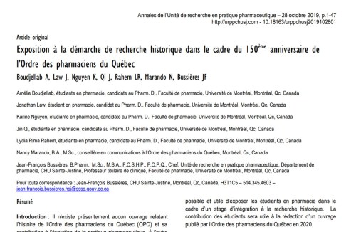 Dans le cadre d’un stage d’intégration au programme de Doctorat professionnel en pharmacie de la Faculté de pharmacie de l’Université de Montréal, une équipe de cinq étudiants s’est intéressée à l’histoire de l’Ordre des pharmaciens du Québec. L’équipe de stagiaires était composée de Amélie Boudjellab, Lydia Rahem, Jonathan Law, Karine Nguyen, Jin Qi. Le stage était sous la responsabilité de JF Bussières et Nancy Marando. Le stage avait pour objectif d’exposer les étudiants à la méthode de recherche historique par la recherche documentaire et la réalisation d’entrevues. Les données recueillies par ces étudiants seront utilisées par l’équipe de l’Ordre des pharmaciens du Québec pour leurs communications entourant le 150ème anniversaire de l’organisme. Afin de mettre en valeur le fruit du travail des étudiants, une affiche a été présentée à la Faculté de pharmacie en juin 2019. De plus, les étudiants ont publié un article dans les Annales de l’URPP. L’article comporte notamment un fil du temps très complet.