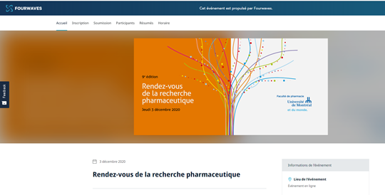 Dans le contexte de la pandémie à la COVID-19, la Faculté de pharmacie a organisé la 9ème édition de son Rendez-vous de la recherche en mode virtuel. On peut consulter le profil des résumés soumis et acceptés – https://pharm.umontreal.ca/fileadmin/pharmacie/documents/pdf/RVRP/Programme_RVRP_2020.pdf.