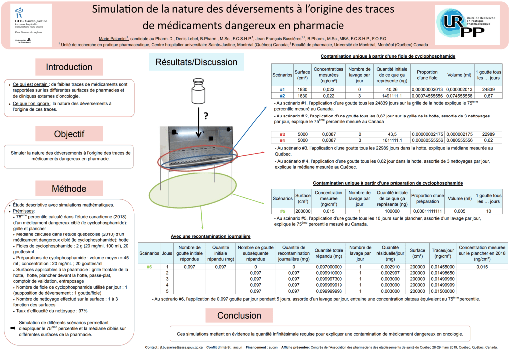 Dans le cadre des travaux de l’URPP, nous avons réalisé une étude descriptive dans le but d’expliquer la nature des déversements à l’origine des traces de médicaments dangereux en pharmacie, et ce, par l’intermédiaire d’une simulation mathématique de différents scénarios.