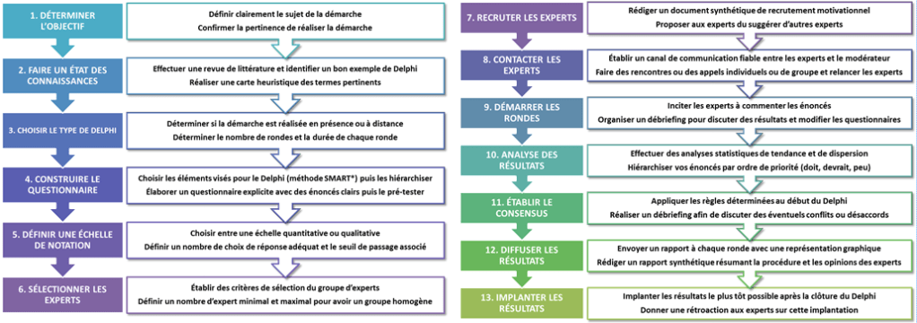 Treize étapes essentielles à la réalisation d’un Delphi ont été identifiées :