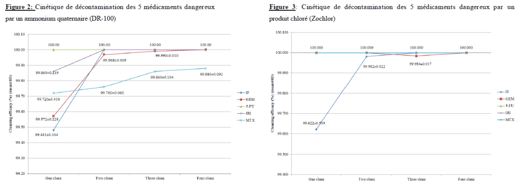 L’étude est réalisée dans une salle avec une hotte (classe IIB2). Une zone de 600 cm2 en acier inoxydable du plancher de la hotte a été contaminée concurremment avec 1 ug d’irinotécan (I), 1 ug de méthotrexate (M), 5ug de gemcitabine (G), 10ug de 5-fluorouracile (5FU) et 15 ug d’ifosfamide (IF). Nous avons testé l’efficacité d’une décontamination avec quatre lavages successifs avec ammonium quaternaire; nous avons répété la simulation avec quatre lavages successifs avec hypochlorite de sodium (NACl0) 0,1%. Une dernière simulation avec un lavage avec eau a été également réalisée. Tous les tests ont été faits en triplicata. .