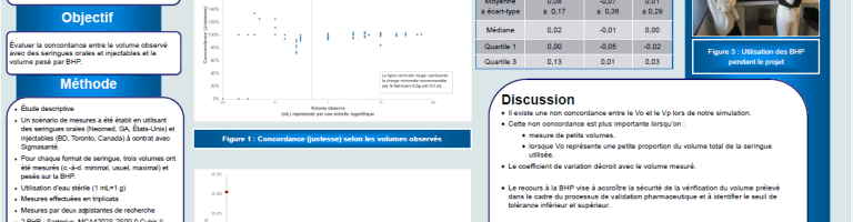 Un scénario de mesures a été établi en utilisant des seringues orales et injectables. Pour chaque format de seringue, trois volumes d’eau stérile ont été mesurés (c.-à-d. minimal, usuel, maximal) et pesés sur la BHP. Chaque volume a été mesuré 3 fois. La concordance entre le volume observé et le volume pesé ainsi que le coefficient de variation pour chaque volume ont été calculés.