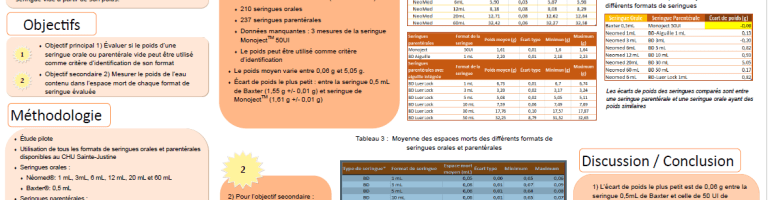 différents formats de seringues. Tous les formats de seringues orales et parentérales disponibles au CHU Sainte-Justine ont fait l’objet de 3 mesures pour 10 seringues de chaque format. Pour évaluer le volume mort, 10 seringues de chaque format ont été pesées à vide puis pleines d’eau (1g = 1 mL) et vidées. Les valeurs moyennes avec écart-type, les valeurs minimales et maximales ont ensuite été calculées.