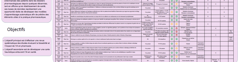 Une revue systématique a été menée afin recenser les études évaluant la faisabilité et l’impact de l’IA en pharmacie et de développer une carte heuristique entourant l’IA en santé.