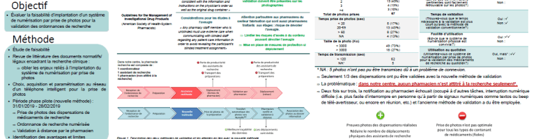Pour cela, une revue de la littérature des documents normatifs/légaux encadrant la recherche clinique a été réalisée afin de cibler les enjeux reliés à l’implantation du système de numérisation par prise de photos. Ensuite, l’équipe a procédé au choix, à l’acquisition et à la paramétrisation au réseau d’un téléphone intelligent pour la prise de photos. Une période de phase pilote s’est déroulé du 31/01/2019 au 28/02/2019. Pendant celle-ci, les dispensations de médicaments de recherche ont été prises en photo et les ordonnance de recherche ont été numérisées pour permettre la validation à distance par le pharmacien. Les avantages et limites de cette pratique ont ensuite été identifiés.
