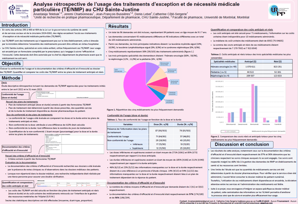Cette étude rétrospective menée au CHU Sainte-Justine vise à évaluer la conformité d’usage et la documentation clinique des médicaments de Nécessité Médicale Particulière (NMP), dont l’utilisation doit être rigoureusement encadrée selon la loi québécoise. Ces médicaments, non inscrits à la liste officielle, nécessitent un formulaire de justification complété par le prescripteur incluant les critères de suivi d’efficacité et d’innocuité.