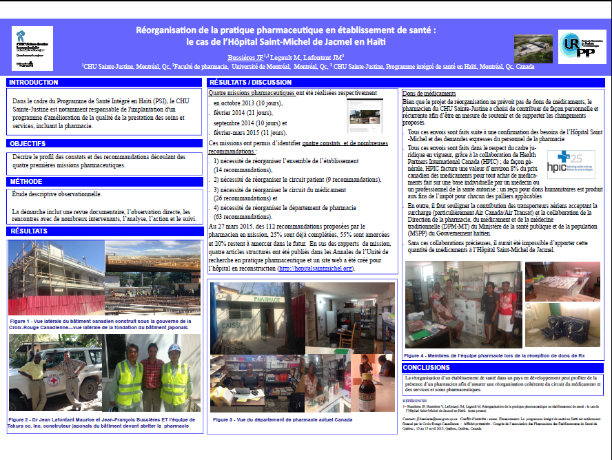 Une affiche sur la révision de processus menée au département de pharmacie du CHUSJ a été soumise et présentée le 10 mai 2017 au Rendez-vous annuel de l’amélioration continue 2017 de la Communauté virtuelle de pratique en amélioration continue (CvPAC). Il s’agit d’un bel exemple de collaboration interdisciplinaire en amélioration continue.