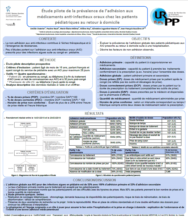 Vous pouvez consulter notre article publié dans l’European Journal of Hospital Pharmacy et notre affiche présentée au Congrès de l’Association étudiante de l’École de santé publique de l’Université de Montréal (AÉÉSPUM), le 2 mai 2019, Montréal, Qc, Canada.
