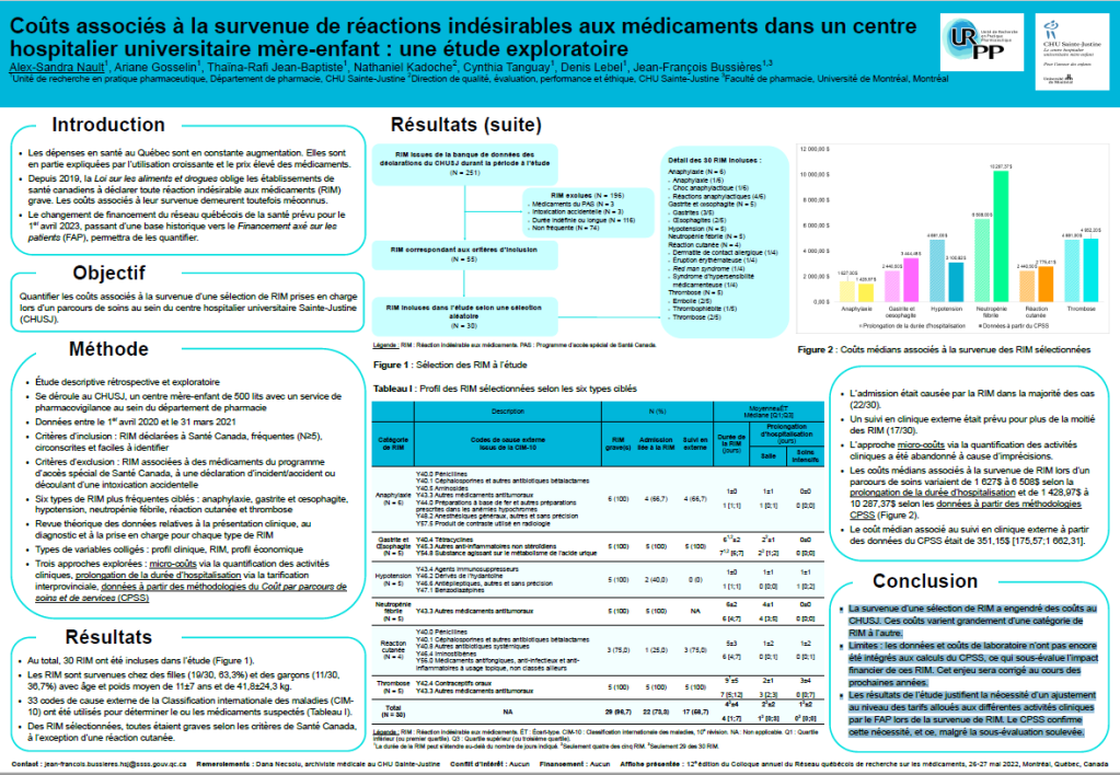 Vous pouvez consulter notre affiche présentée à la 12ème édition du Colloque annuel du Réseau québécois de recherche sur les médicaments, le 26 mai 2022, à Montréal, Québec, Canada.