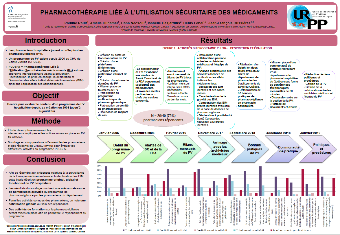 Les pharmaciens hospitaliers jouent un rôle pivot en pharmacovigilance (PV). Au CHU Sainte-Justine (CHUSJ) un programme de PV existe depuis 2006 . La Pharmacothérapie Liée à l’Utilisation Sécuritaire des médicaments (PLUSRx) est une approche interdisciplinaire visant la prévention, l’identification, la prise en charge, la déclaration et l’évaluation des effets indésirables médicamenteux (EIM) ainsi que l’application des connaissances.
