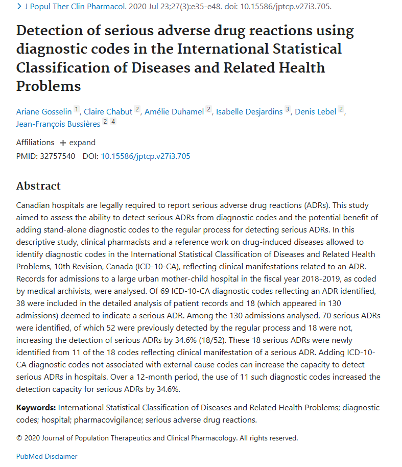 Vous pouvez consulter notre article publié dans le journal of population therapeutics and clinical pharmacology.