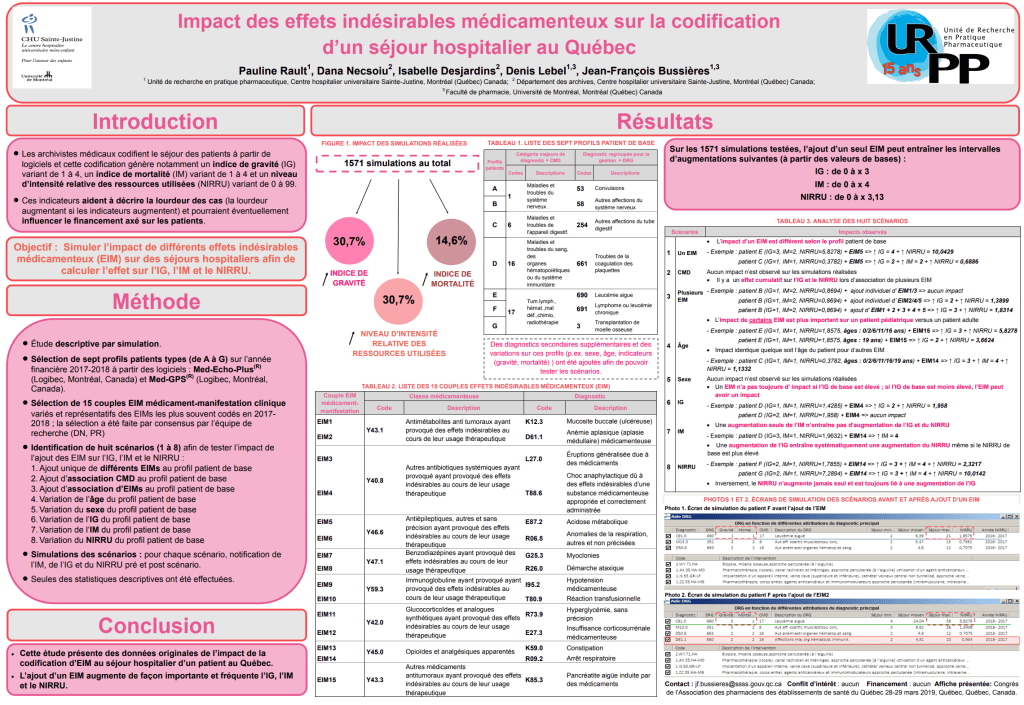 Ainsi, nous avons contacté les parents de 71 jeunes patients (entre 0 à 21 ans, âge médian 6,9 mois) ayant reçu au moins une prescription d’une préparation magistrale pour faire un suivi téléphonique, et ce, sept à dix jours post-congé. Nous avons également contacté les pharmacies distributrices pour obtenir de l’information additionnel sur leur préparation magistrale. Sur 314 éléments détectés, 252 ont été considérés comme étant de réels problèmes : 9 problèmes majeurs et 243 problèmes mineurs avec de réels ou potentiels conséquences.