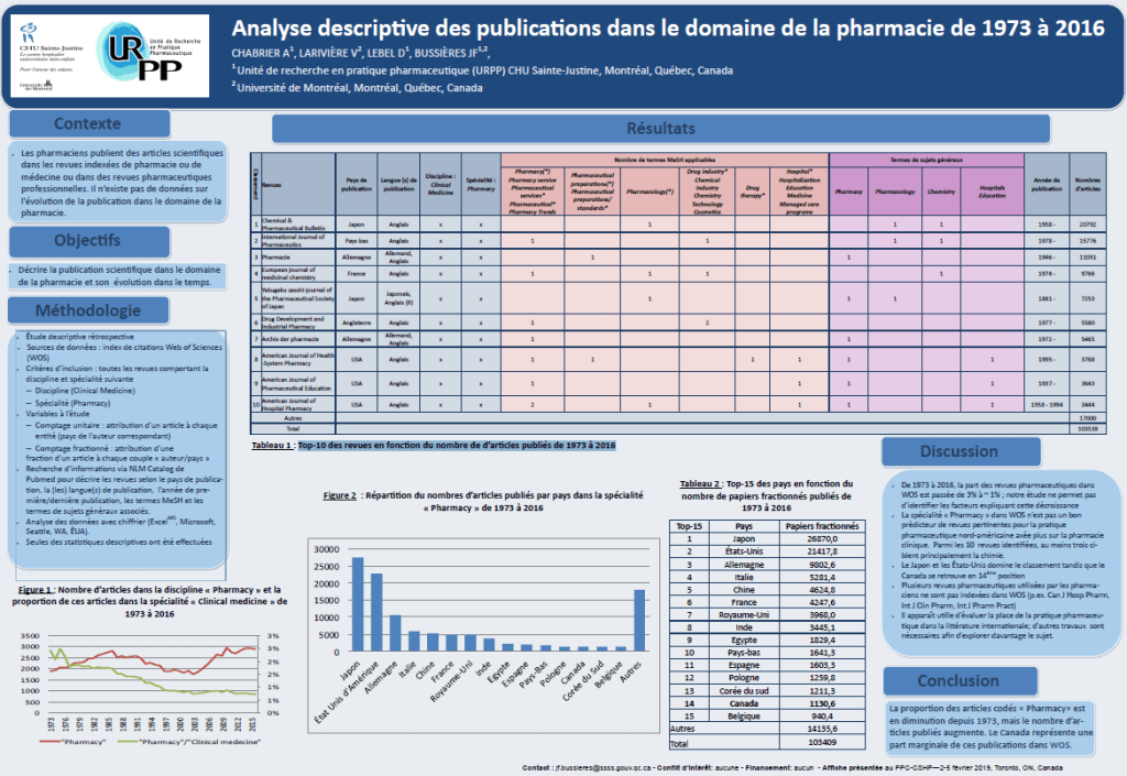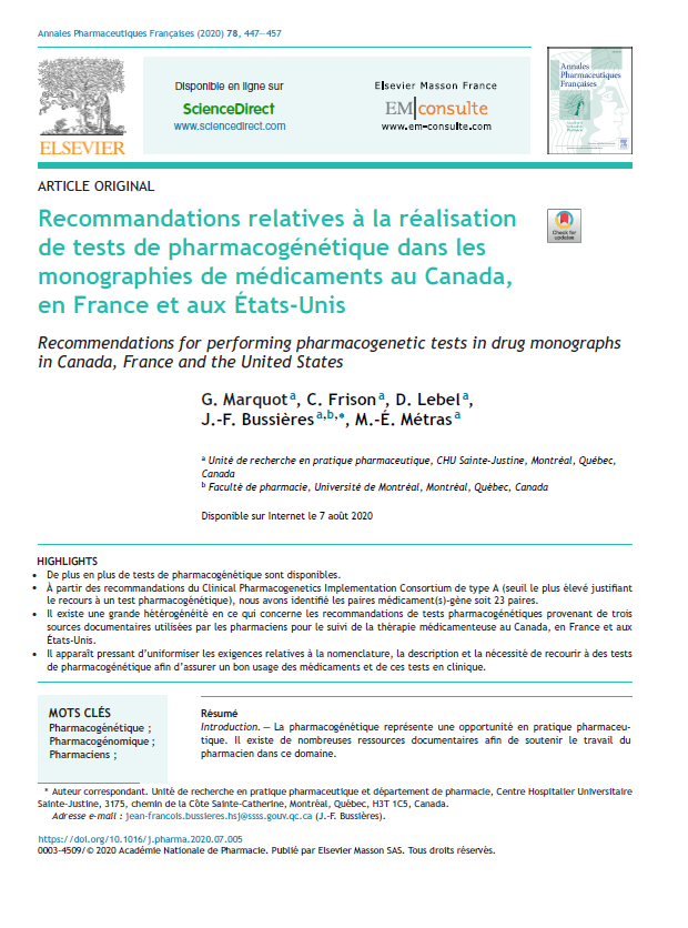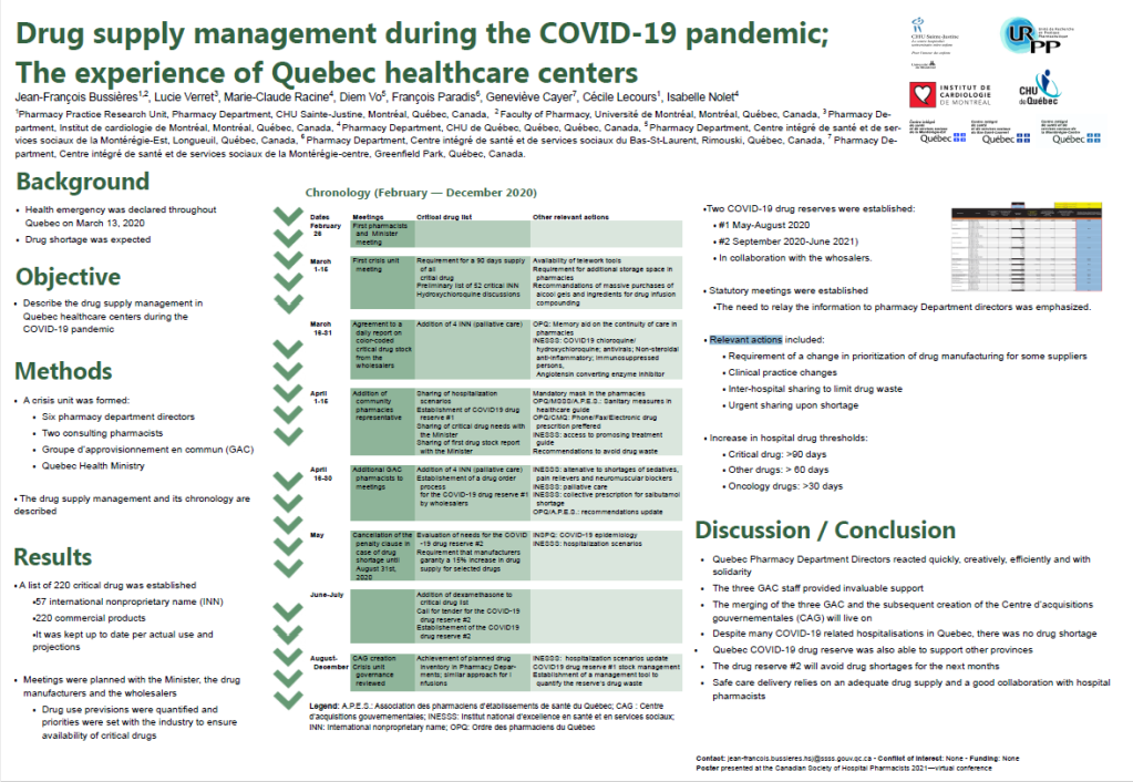 Étude 2019 : Journal of Oncology Pharmacy Practice / Affiche présentée au congrès Canadian Society of Hospital Pharmacists – Professional Practice Conference, – February 1-4th 2020, Toronto, ON, Canada.