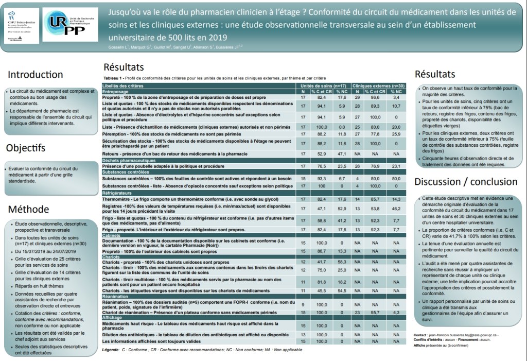 Vous pouvez consulter notre article publié dans le Canadian Journal of Hospital Pharmacy et notre affiche présentée à la Société Française de Pharmacie Clinique, le 26 janvier 2020, à Marseille, France.