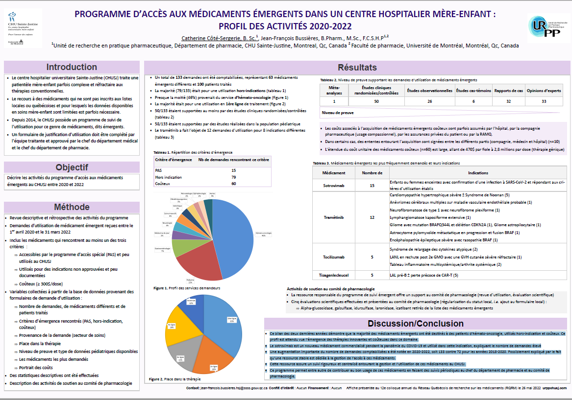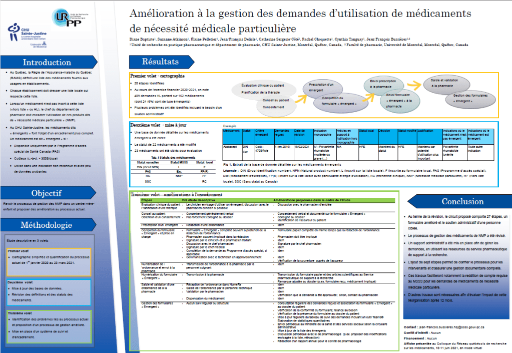 Vous pouvez consulter notre affiche présentée au 12ème Colloque du Réseau québécois de recherche sur les médicaments à Montréal, le 26 mai 2022.