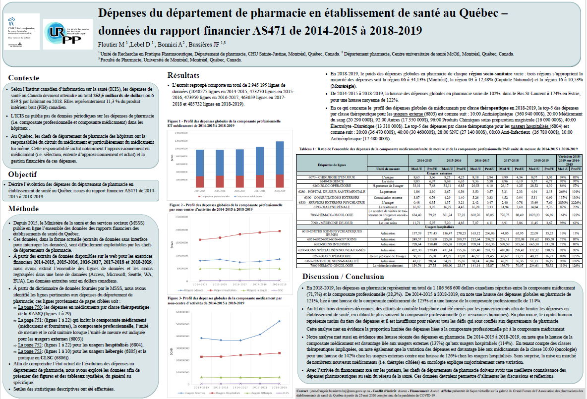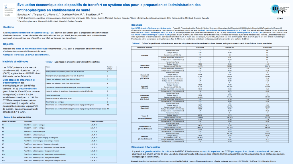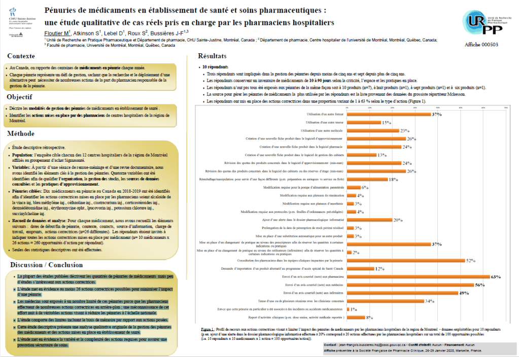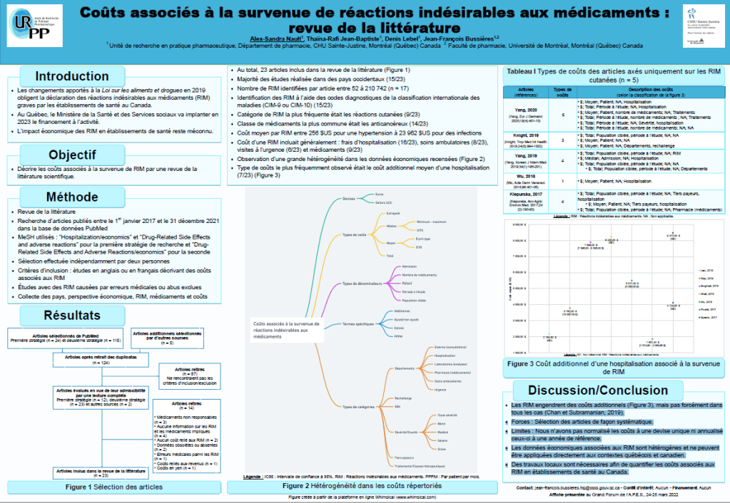 Vous pouvez consulter notre affiche présentée au Grand Forum 2022 de l’Association des pharmaciens des établissements de santé du Québec (A.P.E.S.) le 25 mars 2022.