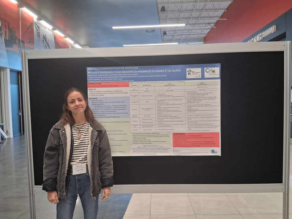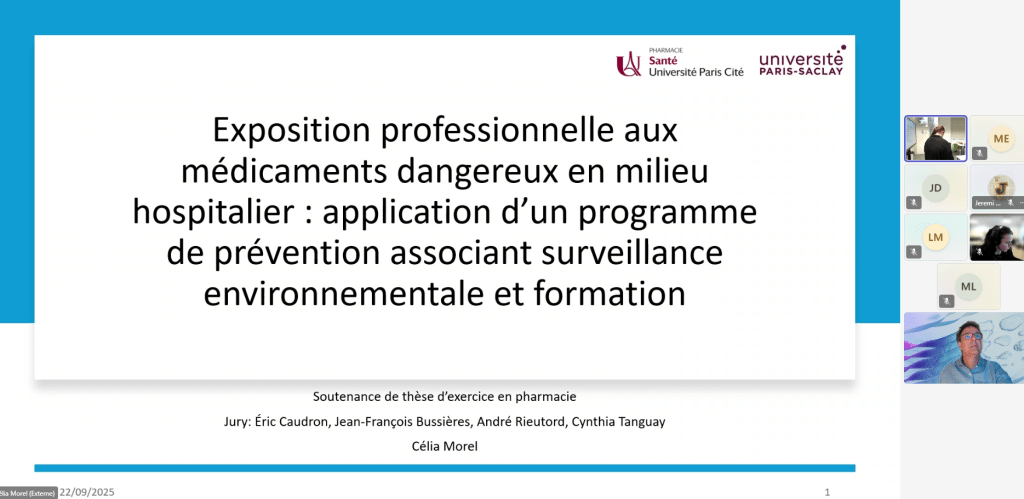 Célia Morel, qui a complété une année de résidence spécialisée au sein de l’Unité de recherche en pratique pharmaceutique de novembre 2023 à octobre 2024, a présenté sa thèse d’exercice le lundi 22 septembre 2025 à la Faculté de pharmacie de l’Université Paris-Saclay et dont le titre est : « Exposition professionnelle aux médicaments dangereux en milieu hospitalier : application d’un programme de prévention associant surveillance environnementale et formation ». Le jury était présidé par Éric Caudron ; le directeur de thèse était Jean-François Bussières, assisté de Cynthia Tanguay. Le jury était également composé d’André Rieutord. Une partie du jury et des participants étaient en mode hybride en direct de Montréal.