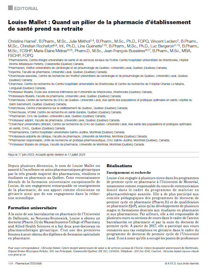 Après 29 années d’engagement au sein de Pharmactuel, le comité éditorial salue avec gratitude une carrière exceptionnelle et une contribution inestimable à l’avancement de la pharmacie hospitalière et universitaire.