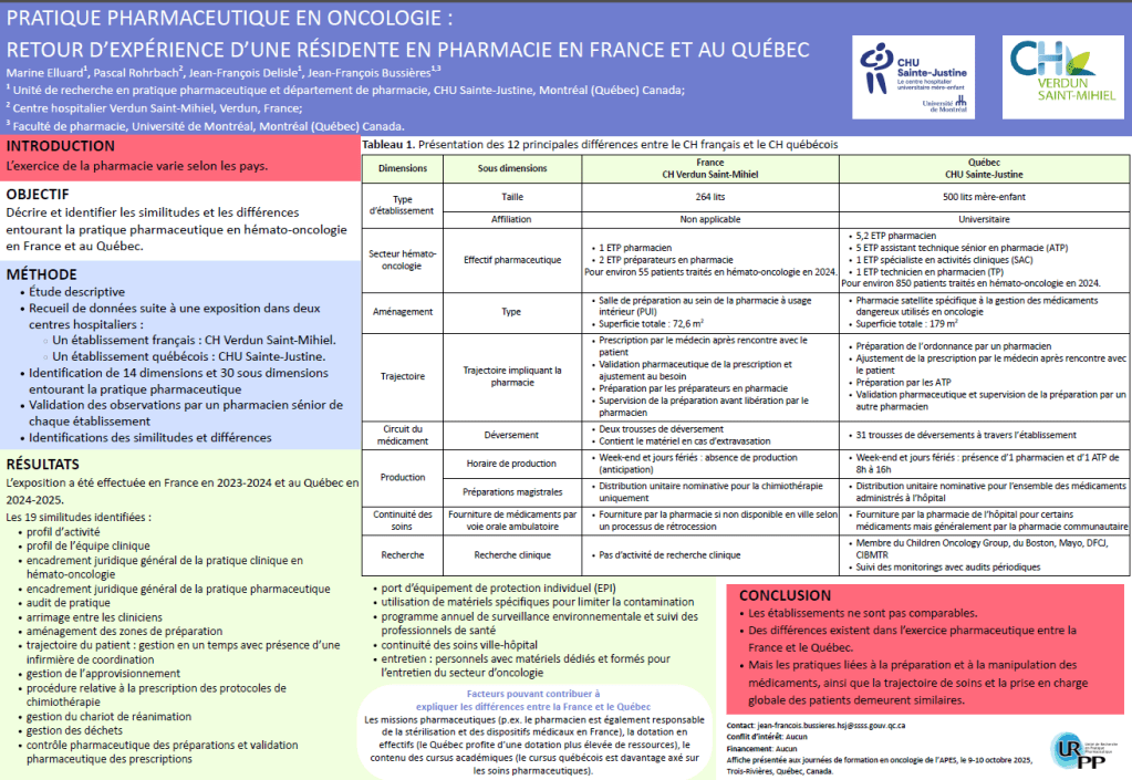 Événement 23e anniversaire de l’URPP le 21 octobre 2025 15h00 15:00 à 15:10 Jean-François Bussières et Cynthia Tanguay – Mot de bienvenue et bilan 2025 des activités de l’URPP 15h10 à 15h20 Juliette Mutin et Marine Elluard – Développement d’un observatoire de la publication scientifique des pharmaciens hospitaliers québécois 15:20 à 15:50 Présentation flash de projets en 120 secondes – 15h20 Jérémi Charbonneau – Analyse rétrospective de l’usage des traitements d’exception et de nécessité médicale particulière (TE/NMP) au CHU Sainte-Justine – 15h23 Marine Élluard – Portrait de la contamination de surface aux antinéoplasiques au Canada en 2025 – 15h26 Sarah Dahdah – Vers une pharmacie écoresponsable en recherche – 15h29 Guillaume Escoffier – Développement durable en pharmacie – bilan carbone du département du CHUSJ – 15h32 Louise Lardeux – Consentement et formulaires d’accès aux médicaments de spécialités – portrait de la situation – 15h35 Virginie Pedneault – Grand dictionnaire canadien de l’histoire de la pharmacie : enrichissement lexical et nouvelles ressources – 15h38 Myriam Rousseau – Le fer isomaltoside-1000 au sein du CHU Sainte- Justine : un regard sur l’innocuité chez la population gynéco-obstétricale – 15h41 Thaina-Rafi Jean-Baptiste – Florababy, un cas de pharmacovigilance – 15h44 Inès Mafille – RUMPOH-2 : Étude rétrospective des effets de la méthadone sur la prolongation du QTc et Torsades de Pointes en pédiatrie – 15h47 Jessica Tewfik – L’implication du CHU Sainte-Justine dans le réseau CPNDS : la pharmacogénomique en action 15:50 à 16:00 – Perspectives futures et échanges avec les participants en présence et en ligne
