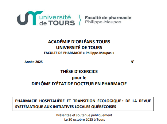 Dans le cadre d’un séjour de huit mois à l’Unité de recherche en pratique pharmaceutique, Guillaume Escoffier a été impliqué dans la thématique du développement durable. L’équipe du département de pharmacie du CHU Sainte-Justine s’implique en développement durable depuis 2013. En collaboration avec Geneviève Ouellet, pharmacienne responsable du volet de développement durable au département de pharmacie du CHUSJ, plusieurs travaux ont été menés, notamment