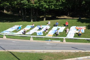 Lettres de l’URPP réalisées sur un versant de l’Université de Montréal en utilisant des dizaines d’affiches lors du 13ème anniversaire de l’URPP à l’automne 2015