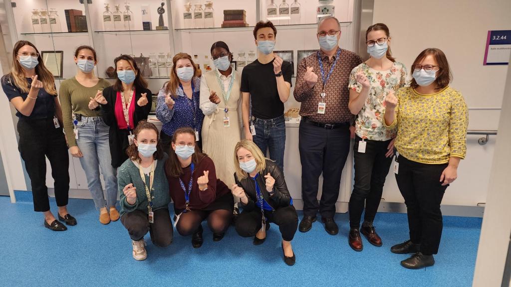 L’équipe de l’URPP en mai 2021. De gauche à droite : Clémence Delafoy, Élisabeth Farcy, Catherine Côté-Sergerie, Thaina-Rafi Jean-Baptiste, Rachel Choquette, Jean-François Bussières, Suzanne Atkinson, Denis Lebel, Aurélie Bleuse, Cynthia Tanguay, Duc Tam Bui. Absents sur la photo : Ariane Gosselin, Sarah-Jane Ganon-Lépine